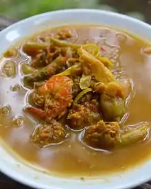 Kaeng som or gaeng som[1] (Thai: แกงส้ม, pronounced [kɛ̄ːŋ sôm]) or Asam rebus or Thai/Lao/Malaysian sour curry[2] is a sour and spicy fish curry or soup with vegetables popular in Southeast Asia.[3] The curry is characteristic for its sour taste, which comes from tamarind (makham). The recipe uses palm sugar (Thai: น้ำตาลปี๊บ, namtan pip) to sweeten the curry.