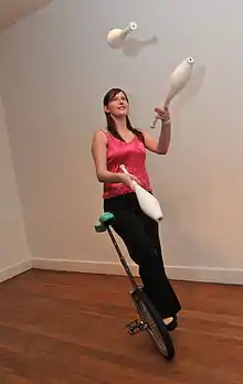 In 2001, just after her 15th birthday, Kaleigh became the first unicyclist to appear on Aster and Keli - one of Iceland's most popular children's TV programmes. That year, she also made an appearance at the British Juggling Convention held in Cardiff[3] and performed for the British Ambassador in Washington DC.[4]