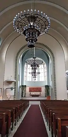 Kallio Church (Finnish: Kallion kirkko, Swedish: Berghälls kyrka) is a Lutheran church in the Kallio district of Helsinki, Finland. It was designed by Lars Sonck and represents National Romanticism with Art Nouveau influences. The National Romantic style appears in the use of traditional Finnish materials and in the church's massive, gray granite body, as well as in nature-inspired colours and decorative motifs.