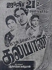 Kalyani is a 1952 Indian Tamil-language psychological drama film directed by Acharya (T. G. Raghavacharya) and M. Masthan, and produced by T. R. Sundaram under Modern Theatres. The film portrays the life of a mentally-deranged man and is heavily inspired by 1948 American film The Snake Pit. It was later remade in Telugu as Atthainti Kaapuram in 1952. Kalyani stars M. N. Nambiar. B. S. Saroja, D. Balasubramaniam, M. G. Chakrapani and T. P. Muthulakshmi had supporting roles.[1]