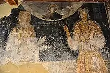 Of greatest interest is the fourth composition of historical figures, a young man and a woman, which was painted on the lowest west wall of the narthex and includes inscriptions in Old Church Slavonic.[1] The figures are painted facing the viewer. The man's red clothing is covered in pearls and double-headed eagles, and he wears an archaic-looking despot's crown on his head. In his right hand, the man holds a sceptre with a cross.[7] He extends his hand to a woman, clad in a despotissa's attire and wearing a fitting crown.[1][4]