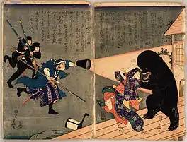 Kamikiri no Kidan (1868), a nishiki-e by Utagawa Yoshifuji, also depicts a "kamikiri," but in contrast to the depictions in the aforementioned emakimono, it is depicted as completely black, based on a story of having actually encountered it[11] (refer to the picture).