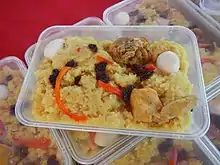 Some popular Kapampangan dishes that have won over the Filipino palate across the country include its famous sisig, morcon, menudo, caldereta, estofado, embotido, asado, lengua, lechon, chicharon, afritada, bringhi (paella), tabang talangka (crab meat), the "tocino" or pindang and their native version of the longaniza. A unique Kapampangan dish that is well enjoyed by other ethnic groups is nasing biringyi (chicken saffron rice). Since nasing biringyi is so difficult to prepare, this unique Kapampangan dish can only be enjoyed during fiestas in Pampanga. It should be compared to the Nasi Briyani dish of Malaysia.[7]