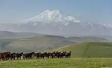In 1998 a group of Karachay-Cherkessia horsemen with three Karachay horses ascended the eastern summit of Mount Elbrus, the highest mountain in Europe - an unprecedented act. In 1999 horsemen with Karachay horses ascended the western summit of the same mountain.[7] This shows how strong and well adapted the Karachay horse is for climbing mountains. Special credit goes to an expert on horse breeding, Klych Geriy Urusov, who was the mastermind behind this equestrian conquest of Elbrus.[14] At the present time the Karachay horse is bred at Karachaevsky (Malokarachaevski) stud farm 168 and other stud farms. In 2008, there were about 20,000 Karachay horses in Karachay-Cherkessia.[15]