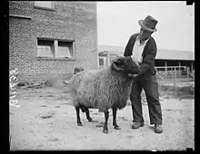 Very young or even fetal Karakul lambs are prized for pelts. Newborn karakul sheep pelts are called karakul (also spelled caracul), swakara (portmanteau of South West Africa Karakul), astrakhan (Russian and French), Persian lamb, agnello di Persia (Italian), krimmer (Russian) and garaköli bagana (Turkmen). Sometimes the terms for newborn lambs' and fetal lambs' pelts are used interchangeably.[3] The newborn lambs have a tight, curly pattern of hair. The lambs must be under three days old when they are killed, or they will lose their black color and soft, tightly wound coils of fur.[4] Dark colors are dominant and lambs often darken in color as they age. Fetal karakul lamb pelts are called broadtail, Breitschwanz (German), and karakulcha. Fetal karakul lambs are harvested through miscarriages, induced early delivery or by killing the mother sheep and removing the fetus.[5] Rather than killing healthy female sheep, farmers will kill older sheep that have already given birth many times.[5] People use the lamb pelts to create various clothing items, such as the Astrakhan or karakul hat.[6] The pelts have also been used in haute couture.[7][8] An Astrakhan collar has been used on women's suits[9] and on expensive overcoats. King George V had a beaver-lined overcoat with an astrakhan collar that was later worn by his son, the Duke of Windsor.[10] The astrakhan collar has appeared in more recent men's fashions, and astrakhan has been featured more extensively in the form of a Formula One-style driving suit made primarily of astrakhan.[11]