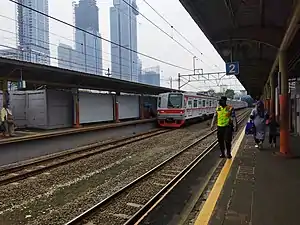 Karet Station (KAT[1]) is a railway station located in Kebon Melati, Tanah Abang, Central Jakarta. This station lies on the north bank of West Flood Canal. This station only serves Commuterline trains. This station and Sudirman station are spaced only 0.8 km between each other, making it one of the shortest stretch between any two stations in the network. It only takes one minute to travel between these two stations.[2] BNI City railway station, a station that serves Soekarno–Hatta Airport Rail Link exclusively, is wedged between these two station.