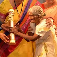 Karthyayani Amma became a Commonwealth of Learning Goodwill Ambassador in 2019.[8] In March 2020, she was honoured with the Nari Shakti Puraskar 2019 award, presented by Ram Nath Kovind, the President of India. She had to fly to Delhi. Amma had never flown before but she was reassured by a former awardee M.S. Sunil days before she flew to the Presidential Palace.[9] Another recipient of the award was fellow Keralan Bhageerathi Amma, who at 105 is the oldest person to have passed an Aksharalaksham examination.[10]