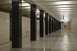 The station consists of two parallel halls of identical pillar-trispan (centipede) design typical of the 1960s stations. Decoratively the halls differ from each other no more than from any other centipede stations built at the time. The eastern hall work of architects Nikolay Demchinsky and Yuliya Kolesnikova, features a grey marble coat on the rectangular pillars, white ceramic tiles on the walls (with a black socle on the tracks) and red granite floor with an asphalt on the platform edge.