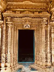 The doors at the entrances at the gudha-mandapa, states Dhaky, are "graced by a very highly ornate" artwork. They correspond to the teachings in to the Vastu Sastras, illustrating doorways reserved for temples built by a sovereign king. The doorways are a compound composition, an inner satsakha for Surya and saptasakha for Shiva, wrapped with an outer trisakha. These are parallel concentric bands of elaborate carvings. They show ratna (jewelled layer), artha (theme of people), two bands of kama (mithuna, amorous couples, eros), stambha, vyala, valli, and padma bands. Scholars such as Cousens, Campbell, Dhaky in different words call these as, " exquisitely carved and carefully finished" and one where the 11th-century artists achieved on the stone the craftsmanship one expects on "bronze and silver".[3][27] It is, states Cousens, "delicate work of perforated filigree with fine tracery", completed such that the innumerable interstices cast a natural shadow. The blackness of this shadow accentuates the artwork on the stone; just how the artists used their tools and worked these small holes and forms, states Cousens, is "marvellous".[27]