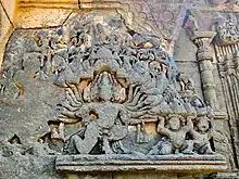 The upabhadra parts of the outer walls are equally innovative. Along with decorative elements drawn from themes of nature, they are filled with narrative scenes from Hindu legends. In particular, elephant-themed legends from the Mahabharata, the Ramayana and the Shiva Purana are depicted, for instance the Gajantaka, the Kailasaharana and the Tarakasura-vadha legends.[3]