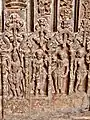 According to Cousens, the doorpost mouldings on the southern and eastern doorway are worthy of mention. On both sides of the southern doorway are four inner bands of scrolls which run up the sides and around the lower part of the entablature above. Next to these bands, on either side, in the centre, are tall columns or pilasters supporting the lower cornice above. Beyond these columns, on either side, are four more bands of decorative mouldings.[30] Above the lower cornice, the entablature consists of small figures, now numbering only three (must have been eleven originally) standing under cusped arches. Above these figures is a valance of beads hanging in festoons. Above the cornice is a procession of men and animals. These images include horsemen and musicians.[31]