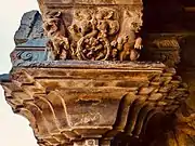 The ranga-mandapa in the Shiva temple is square and supported by beautiful lathe-carved pillars, that appear to have been polished and assembled. The smoothness and symmetry achieved in the massive stone pillar, states Cousens, is one expected with a pillar made of ivory or silver.[28] The bottom of the pillars are carved in three dimensions (damaged), with framed sections highlighting Hindu motifs and depicting the epic legends. The brackets, above the capitals, have little lions, set within kirtimukhas. Pepal leaf scrolls highlight the otherwise smooth surface. To the south of the ranga-mandapa are stairs to enter the temple.[28]