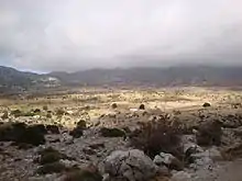 Katharo is a plateau on the Dikti mountain on the island of Crete, in the regional unit of Lassithi. Administratively it belongs to the municipality of Agios Nikolaos, (municipal division of Kritsa). It is 16 km (9.9 mi) from Kritsa (asphalt road) and 12 km (7.5 mi) from Mesa Lassithi (rough mountain road). It is 4 km (2.5 mi) long, 1.5 km (0.93 mi) wide and at an average altitude of 1,150 m (3,770 ft) above sea level, (300 m (980 ft) higher than Lasithi Plateau). On the West of the Katharo are the peaks of Spathi (2,148 m (7,047 ft)) and Lazaros (2,085 m (6,841 ft)), and on the North East and East are the peaks of Tsivi (1,665 m (5,463 ft)) and Platia Koryfi (1,485 m (4,872 ft)). The waters of the Plateau drain through the Havgas gorge into the much larger but lower Plateau of Lassithi, i.e. Katharo is part of river Aposelemis drainage area.
