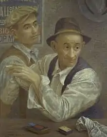 Fellow artist, friend, art historian, curator, and critic, Lloyd Goodrich said that Schmidt's technical command increased during the early 1930s and this command was most apparent in her still life work: "Every object was modeled with a complete roundness and a sensation of solidity and weight... The relations of each element to the others, and to the space in which they were contained, were clearly understood. The result was finely conceived, closely knit design. Color was full-bodied, earthy, neither sweet nor brilliant."[15]: 8 At this time she began to make figure studies of the Depression's victims and for portraying these subjects Edward Alden Jewell wrote that she was "the right artist for the right task." Describing the paintings in a 1939 solo show at the Downtown as "delightfully congruous," he said they revealed "a charming, subtle style that has ripened and that has real stature."[49] Goodrich described one of these figure studies, "Broe and McDonald Listen In," as different from "the idealized pictures of the proletariat common at the time" and said "every element" of the painting "played its part as form, even Broe's shirtsleeves, whose folds were as consciously designed as the draperies in old masters."[15]: 12 [note 19]