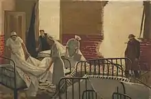 During World War II, Guthrie submitted several works to the War Artists' Advisory Committee and the Committee did acquire one of the paintings she produced during the conflict, that of a bombed hospital ward.[6][7] The painting shows the scene in a hospital ward after it has been hit by a bomb that has left a large hole in a wall and mangled beds. The expressions on the faces of the attending staff, and the blood stained sheets, suggest dead or severely injured patients lying on the floor out of sight of the viewer.[8]
