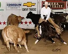 ![]() Kathy Daughn riding Royal Fletch in the Open Division of the 2000 NCHA World Championship Cutting Horse Futurity in Ft. Worth, TX. | |
