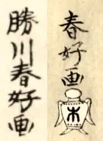 Katsukawa Shunkō I (Japanese: 勝川 春好; 1743 – 1 December 1812) was a Japanese artist who designed ukiyo-e-style woodblock prints and paintings in Edo (modern Tokyo). He was a student of Katsukawa Shunshō, and is generally credited with designing the first large-head actor portraits (ōkubi-e). As his teacher did, Shunkō used a jar-shaped seal and was known as kotsubo ("little jar"). At 45, the right-handed Shunkō became partially paralyzed and ceased designing prints, although he continued producing paintings with his left hand.