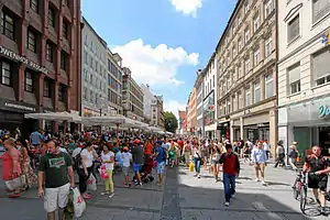 With an average of 12,975 passers-by per hour (as of 5 May 2011), Kaufingerstraße is one of the top-selling shopping streets in Germany. The rental and construction site purchase prices are the highest in the Kaufingerstraße than in any other street in Germany. Rental prices are around 300 € and site purchase prices around 50,000 € per square meter (in 2008). In 2008, the street was one of the 10 shopping miles (9th place) with the highest rents in the world.[1] In 2010, it was, with 11.905 passers-by per hour, in third place of the busiest shopping streets in Germany.[2] In 2011, the Kaufingerstraße slipped to number 4 of the most visited shopping streets in Germany behind the Zeil in Frankfurt am Main (13,035 passers-by per hour). Meanwhile, the Neuhauser road placed second in the list. According to a study by Jones Lang LaSalle (JLL), it was the busiest street in Munich with 13,515 passers-by per hour on the deadline. Also in 2013, the Neuhauser Straße placed second with 11,920 passers-by, this time behind the Dortmunder Westenhellweg (12,950 passers-by).[3] Because of this, Munich is the only German city, which has 2 shopping streets in the list of the most visited five.[4] According to an analysis by JLL from the year 2015, Kaufingerstraße is the most expensive shopping street in Germany with a top rent of 360 Euro per square meter.[5]