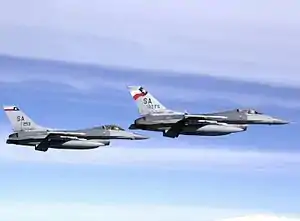 F-16C Block 25F/30F Fighting Falcon fighters (s/n 85-1403, 87-0253) from the 182d Fighter Squadron, 149th Fighter Wing, Texas Air National Guard.