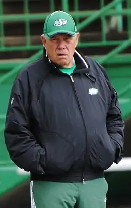 Ken Miller (born October 15, 1941) is currently an offensive consultant for the Montreal Alouettes of the Canadian Football League.[1] He previously served in the league as head coach and vice president of football operations for the Saskatchewan Roughriders. He served as the Roughriders head coach between 2008 and 2010, leading the team to appearances in the Grey Cup in 2009 and 2010. Miller returned as head coach of the Roughriders on August 19, 2011, after the firing of Greg Marshall after a 1–7 start to the 2011 CFL season.[2] Miller was the club's offensive coordinator under head coach Kent Austin when they captured the 95th Grey Cup in 2007. He had previously served on the coaching staffs of the Toronto Argonauts, University of Redlands, Dickinson State, and Yucaipa High School.