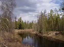 The vegetation of the river basin consists of lightly spread coniferous forests, where the main tree species is larch. There is continuous permafrost in the region.