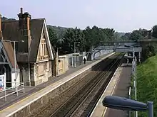 On Platform 2 stands a gabled Grade II listed building station house in the "Old English style of Domestic Architecture" (architect: Richard Whittall)[4] and is similar to the original building at Caterham. This was the original station building which housed a small waiting room for passengers and the original ticket office. In 1899 when the Caterham line was made double-track, a new brick Ticket Office was built on the opposite Platform at road level. The original station house was disused and boarded up for a long time, but protected by its listed status. The house was then sold to a private owner in 2007 following refurbishment.