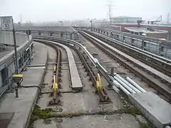 Although Line 3 trains are bidirectionally-operated metro trains, the tracks for Line 3 extends beyond the top floor platform into an above-ground turning loop, similar to those found on the Toronto streetcar system. This was because Line 3 had been planned as a dedicated right-of-way streetcar line, rather than a metro line. As such, the top-floor platform was designed to operate streetcars. Line 3 was later built as a medium-capacity rail transport line to use the Intermediate Capacity Transit System train models built by Bombardier Transportation. The line began using two-car trains, which were able to travel along the turning loop, but was later converted to use four-car trains, which could not be operated along the tight loop. Thus, the use of the loop for reversals was discontinued after 1988, although the loop's elevated structure remains over the passenger pick-up and drop-off building and is now occasionally used as a tail track to store trains. The station platform was reduced to a single track and began using the Spanish solution of unloading and boarding passengers at Kennedy. Original floor finishing and platform edge markings for the planned light rail can also be seen along the current tracks.
