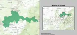 Kentucky's 4th congressional district is a congressional district in the U.S. state of Kentucky. Located in the northeastern portion of the state, it is a long district that follows the Ohio River. However, the district is dominated by its far western portion, comprising the eastern suburbs of Louisville and Northern Kentucky, the Kentucky side of the Cincinnati area.