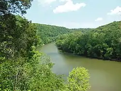 The Middle Fork Kentucky River is a tributary of the North Fork Kentucky River, approximately 105 miles (169 km) long,[2] in southeastern Kentucky. It rises in the Appalachian Mountains in southernmost Leslie County, approximately 16 miles (26 km) from the Virginia state line, and flows north through the Cumberland Plateau past Hyden. At Buckhorn, it is impounded to form the Buckhorn Lake reservoir. North of the reservoir it flows generally northwest and joins the North Fork in Lee County, approximately 5 miles (8 km) east of the confluence of the North and South forks at Beattyville. At Tallega, the river has a mean annual discharge of 792 cubic feet per second.[4]