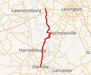 KY 33 begins at US 150 in Danville and proceeds north through Boyle, Mercer, Jessamine, and Woodford counties before terminating at US 62 in Versailles. It shares the road with US 68 in Jessamine and Mercer counties and crosses the Kentucky River near Wilmore.
