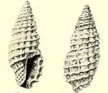 The solid, elongate shell has a uniform dull color and consists of 7 convex whorls, separated by an impressed suture. The two whorls of the protoconch are smooth. The subsequent whorls show axial ribs (10 on the body whorl) and spirally decurrent cords (3 on the penultimate, 6 on the body whorl), forming a remarkable network with quadrangular meshes. The decurrent cords are higher than the axial ribs, forming nodules on the intersections. The body whorl is contracted below but then swells out around the base of the columella. The aperture is oblong and almost quadrangular. The siphonal canal is short and open. The columella is straight and shows a narrow callus. The thick outer lip is denticulate and shows on top a little cutout.[2]