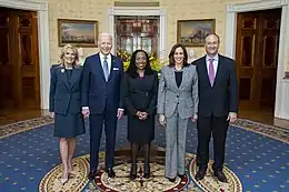 President Joe Biden, First Lady Jill Biden, Vice President Kamala Harris and Second Gentleman Doug Emhoff with Ketanji Brown Jackson in the Blue Room of the White House after her being announced as the nominee, February 25, 2022