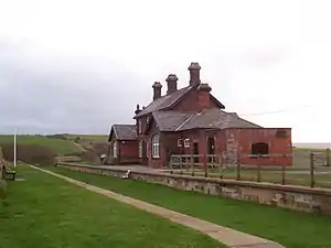 The station was host to a LNER camping coach in 1935, and to two coaches from 1936 to 1939.[9] A coach was positioned here by the North Eastern Region of British Railways from 1954 to 1958.[10] Kettleness was a remote station which was far from any amenities, defined as the remotest station on the Whitby to Loftus railway line.[11] However, campers could order food and other goods through the stationmaster.[12] The coach was withdrawn when the line and station closed to passengers and goods on 5 May 1958.[1][13] The line through the station was closed in 1959.[14]