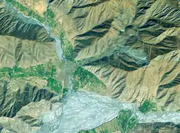 This landslide began with the failure of a large mass of rock high on the western flank of Chokrak Mountain above the village of Khait. The rock mass began to travel to the northwest as a rockslide into the Obi-Khaus-Dara valley. Much of the debris flow material was deposited before the slide reached the valley bottom, but the frontal part of the slide began increasingly to incorporate loess material and to accelerate. This flow continued down the valley floor for more than another 4,000 m, despite the relatively low slope (3.6°). The flow broadened as it reached the main Obi-Kabud River valley, sweeping through part of Khait, crossing the river, before climbing a 25 m high terrace on the river's western bank and continuing a further 700 m, overwhelming the village of Khisorak.[2]