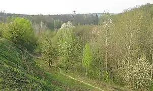 The hillfort adjoins the southern part of Kyiv, namely Feofaniya Park. It occupies a rhombic plateau 1000x700 m wide, bordered by valleys of the streams. All the plateau area, 31 ha, was surrounded with earth rampart, while the slope of the hill was fortified by a scarp with a berm and a moat beneath.[1] The rampart, scarp and berm are well preserved on the western and eastern edges, and remains of the moat are much less conspicuous now. It is supposed that the hillfort had 3 entrances: in the northern, eastern and southern part of the rampart.[2]