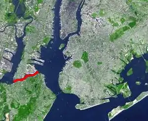 The Kill Van Kull is a tidal strait between Staten Island, New York and Bayonne, New Jersey in the United States. It is approximately 3 miles (4.8 km) long and 1,000 feet (305 m) wide and connects Newark Bay with Upper New York Bay.[1] The Robbins Reef Light marks the eastern end of the Kill, Bergen Point its western end. It is spanned by the Bayonne Bridge and is one of the most heavily traveled waterways in the Port of New York and New Jersey.