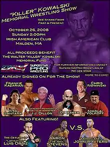 The Walter "Killer" Kowalski Memorial Show was a professional wrestling memorial event co-produced by the Big Time Wrestling (BTW) and United States Wrestling Federation (USWF) promotions, which took place on October 26, 2008, at the Irish American Club in Malden, Massachusetts. The event was held in honor of Walter "Killer" Kowalski, who had died August 30, 2008, a little over three weeks after suffering a heart attack on August 8, 2008. All proceeds from the show were donated to the Walter "Killer" Kowalski Memorial Fund" to help pay for his medical bills;[1] A wrestling memorabilia raffle was another attraction, and which included gift baskets (some filled with WWE t-shirts and DVDs), a broken autographed guitar by The Honky Tonk Man, and autographed Killer Kowalski action figures and photographs donated from wrestlers all over the world. Fans were also able to bid on memorabilia from Kowalski's wrestling career including an original pair of wrestling tights, boots and his mask. In all, over $7,000 was raised.
