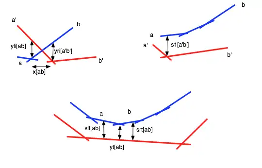The first certificate, , certifies the x-ordering of the points in the red and blue envelopes. The second and third certificates, and , certify intersections of the red and blue envelopes. The remaining 5 certificates, , , , , and place edges that are not in the upper envelopes in the sequence of slopes of the edges that are above it. If the slope is at the start or end of the sequence, or certify this. If it is in the middle of the sequence , and certify this, and certifies that the intersection point of the two lines that the edge's slope is in between, is above it. These one or three certificates suffice to prove that all of the edges are above this line. Unlike the previous scheme all lines are only involved in a constant number of certificates. Whenever of these certificates fail, the merged envelope and certificates can be updated in O(1) time.