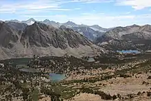 There are several prominent subranges of the Sierra within and around the park. The Palisades, along the park's eastern boundary, have four peaks over 14,000 feet (4,300 m) including the highest point in the park, 14,248 feet (4,343 m) NAVD 88 at the summit of North Palisade.[9] The Great Western Divide extends through the south-central part of the park and also has many peaks over 13,000 feet (4,000 m), including Mount Brewer.[10] The Monarch Divide, stretching between the lower Middle and South Forks of the Kings, has some of the most inaccessible terrain in the entire park. In the northwest section of the park are other very steep and rugged ranges such as the Goddard Divide, LeConte Divide and Black Divide, all of which are dotted with high mountain lakes and separated by deep chasms.