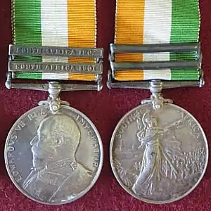 The King's South Africa Medal is a British campaign medal awarded to all British and Colonial military personnel who served in the Second Boer War in South Africa, and who were in the theatre on or after 1 January 1902 and who had completed 18 months service in the conflict prior to 1 June 1902.[1]