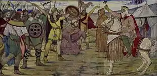 The conversion of the Eóganacht Chaisil, who were Kings of Cashel and gaining more and more influence in Munster, to the detriment of the Corcu Loígde, occurred during the reign of Óengus mac Nad Froích. He was said to have been converted by St. Patrick in a ceremony in which Patrick is supposed to have accidentally pierced the king's foot with his crozier, a pain which Óengus stoically bore, presuming it was part of baptism.[5] Indeed, the very finding of Cashel, which was originally in the land of the Éile and its establishment as the base of the Eóganachta is attributed in the texts Acallam na Senórach and Senchas Fagbála Caisil to a miraculous "vision" of St. Patrick, sixty years beforehand by Corc mac Luigthig. According to the Acallam, Óengus then levied a tri-annual tribute in Munster known as the "scruple of Patrick’s baptism", showing a clear political interest (this was exacted until the times of St. Cormac mac Cuilennáin).[6]