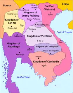 Kingdom of Vientiane was formed in 1707 as a result of the split of the Kingdom of Lan Xang. The kingdom was a Burmese vassal from 1765 to 1824.[1] It then became a Siamese vassal until 1828 when it was annexed by Siam.