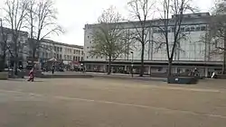 In 1969 and 1974, during a large redevelopment of central Gloucester, the square was redesigned and new shops were built on the east and south sides. Water fountains with stepping stones and paddling areas were created in the centre of the square.[3] Also at this time Kings Street was covered to become an indoor shopping centre called Kings Walk Shopping Centre. The north side of the square was redeveloped in 1984.[1] In 2006, The square was levelled and concreted, as the water fountains had fallen into disrepair. On 20 January 2014, The Golden Egg building, previously a restaurant built in the 1960s, was demolished.[4][5] At the same time, other minor improvements were also made including repainting and the addition of new benches. The square is now mainly used for markets.[6] The square is part of the Kings Quarter redevelopment project, however the plans are for Kings Square to remain as a public open space.[7]