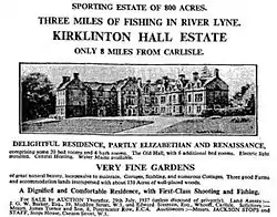 The Grade II listed Kirklinton Hall outside the village has been a ruin which lay derelict for 40 years. Since being bought by the Bolye family in 2012, it has been in the process of being renovated.[5] An advertisement for the hall before its decay is shown on the left.