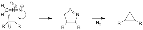 Certain diazo compounds, such as diazomethane, can react with olefins to produce cyclopropanes in a 2 step manner. The first step involves a 1,3-dipolar cycloaddition to form a pyrazoline which then undergoes denitrogenation, either photochemically or by thermal decomposition, to give cyclopropane. The thermal route, which often uses KOH and platinum as catalysts, is also known as the Kishner cyclopropane synthesis after the Russian chemist Nikolai Kischner[7][8] and can also be performed using hydrazine and α,β-unsaturated carbonyl compounds.[9] The mechanism of decomposition has been the subject of several studies and remains somewhat controversial, although it is broadly thought to proceed via a diradical species.[10][11] In terms of green chemistry this method is superior to other carbene based cyclopropanations; as it does not involve metals or halogenated reagents, and produces only N2 as a by-product. However the reaction can be dangerous as trace amounts of unreacted diazo compounds may explode during the thermal rearrangement of the pyrazoline.
