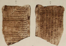 Sinclair was assisted in his works by Demetrios Pieridis; Sinclair's 5 July 1879 report described: "2 Phoenician inscriptions have been found written in some sort of paint on stone & being (according to Mr. Pierides) accounts of wages."[4] The finds were brought to the attention of the British Museum in 1880 in a report from Charles Thomas Newton, forwarding a letter from Charles Abbott, 3rd Baron Tenterden on behalf of Granville Leveson-Gower, 2nd Earl Granville. Newton's report stated:[5]
