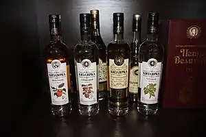 Alcohol is aged in barrels for up to one and a half years by distillation of grape must, acquiring a yellow tint over time.[2] Sugar syrup and water are then added, the amount of the latter added determining the alcohol content of the Kizlyarka. Generally, there are three types of Kizlyarka. "Original" is not aged and has an alcohol content of 40%; "traditional" is aged for 7 months and has an alcohol content of 40%; and "aged" is aged for 18 months and has an alcohol content of 45%.[3]