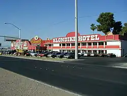 The Klondike received a gaming license in 1982,[21][22] and ultimately became known as the Klondike Hotel and Casino,[15][23] while retaining the Klondike Inn name.[13][24] The Klondike included a western theme,[25][26] and was the first hotel-casino encountered by people travelling north on the Las Vegas Strip.[23][25] The hotel contained 153 rooms, and the casino measured 7,700 sq ft (720 m2).[27] The Klondike was popular among local residents and was known for its cheap restaurant specials and cheap gambling,[16][20][23] while the hotel was popular for its low room rates.[23] According to Woodrum, approximately 90 percent of the Klondike's customers were local residents.[28] In its later years, the hotel's clientele included out-of-town construction workers.[15][23] Bob Stupak, a longtime friend of Woodrum, was a frequent customer at the Klondike, as well as singer Tom Jones.[20][29]