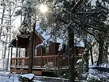 The park features six different cabins that host up to eight guests and over forty campsites with restrooms and shower houses.