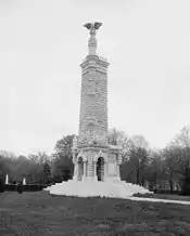 Completed in 1901, the monument initially stood 50 feet (15 m) – the height having been calculated to surpass that of the Confederates' monument – and was topped by a bronze eagle with wings spread.[1][2] On August 22, 1904, however, the eagle was shattered by a bolt of lightning, the sound of which rattled Knoxville and could be heard for miles all around.[1] Undaunted, the GAR commissioners planned immediate reconstruction, using federal funds secured by Congressman Henry R. Gibson. The new monument, designed by the local architectural firm Baumann Brothers, largely followed the original design, the exception being a marble statue of a Union soldier placed atop the monument rather than an eagle. The new monument was completed on October 15, 1906.[2]